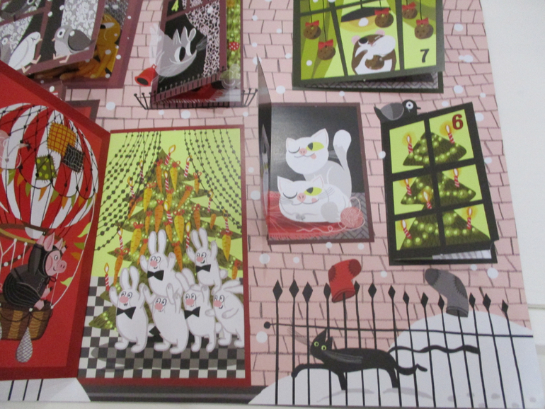 Адвент-календарь «Новый год вот-вот...» выполнен в виде домика с 14 окошками, в котором живут самые разные обитатели (пингвины, динозаврик, зайчики, летучие мыши, слон, еноты и другие).