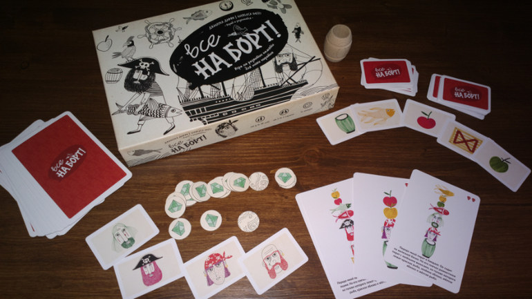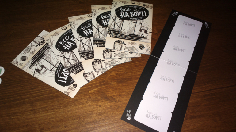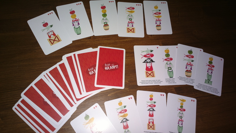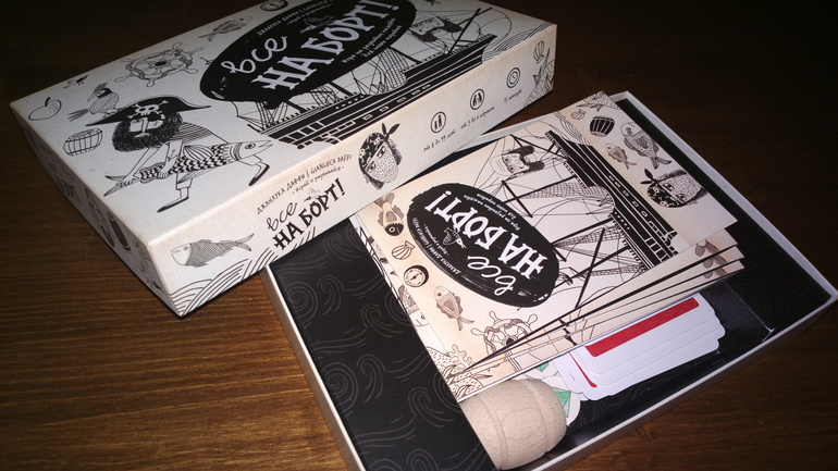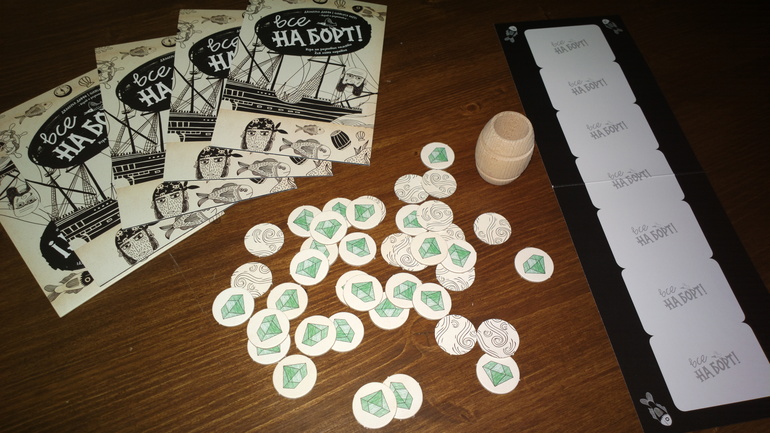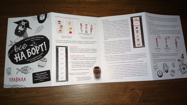 6. Тот, кто первым собрал последовательность на планшете, должен взять деревянную бочку и крикнуть: "Все на борт!" После этого игра останавливается, ведущий показывает всем свою карточку и сверяет изображение на ней с последовательностью на планшете игрока с бочкой.