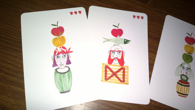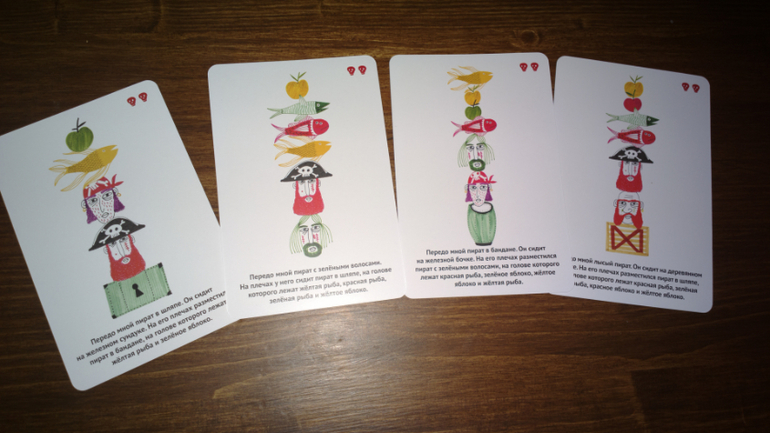 4. Выбирается игрок, который первым станет ведущим. Он тянет карточку "Портреты" и зачитывает текст на ней или же сввоими словами описывает изображения на карточке. Пока говорит ведущий, трогать карточки "Пираты и объекты" остальным игрокам запрещается.