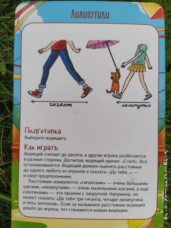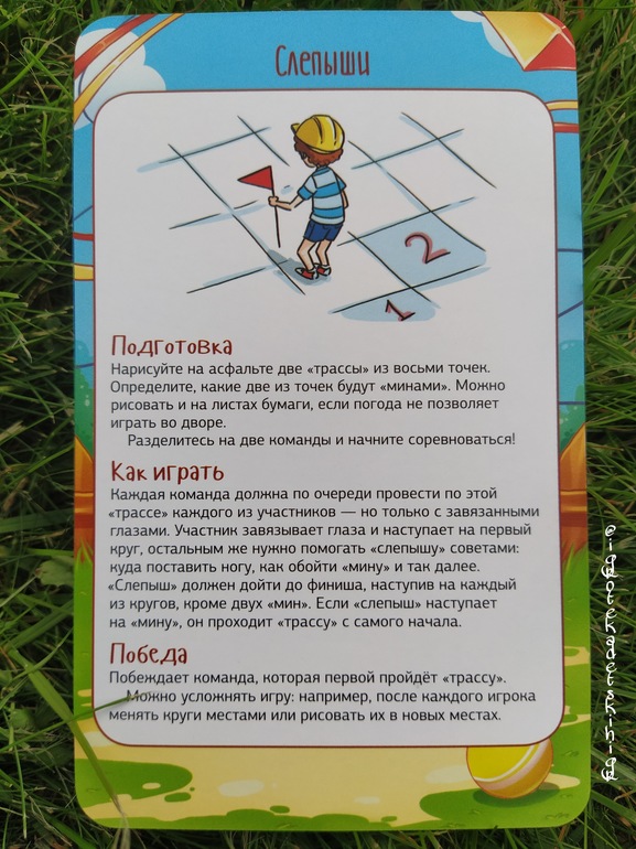 Но правила переделали. Разделились на команды по 3 человека. Выбрали по одному игроку, завязали им глаза и остальным нужно было, давая команды, довести первым до определенной цели. Шаги игроки должны были делать из игры "Лилипутики".