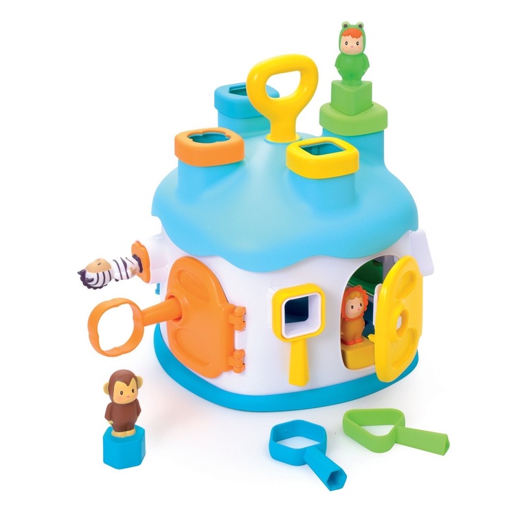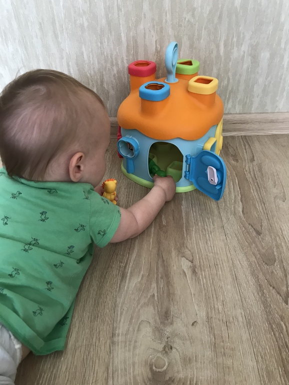 Играет сам - домик всегда стоит на полу и ребёнок обычно доползает до него сам, устраивается поудобнее, открывает дверку, просовывает руку и достаёт изнутри фигурки животных. Пока ещё не умеет их помещать по нужным отверстиям внутрь, но уже пытается. Играет ключами от дверей, их тоже пытается просовывать в фигурные отверстия сверху домика.
