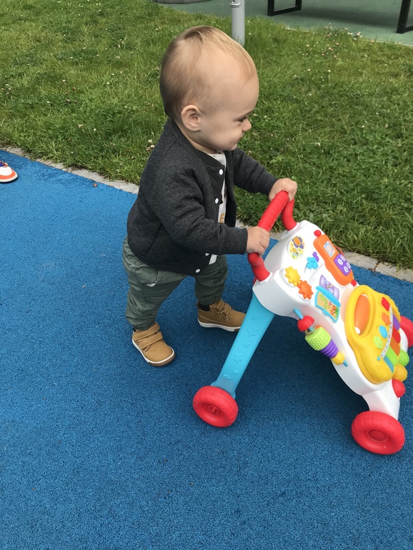 Когда Илюня стал толкать по дому стулья и табуретки, мы поняли что есть у человека потребность ходить, но с опорой. Купили ему эти ходунки, и по началу он боялся с ними ходить так как не мог отрегулировать скорость - разгонялся, пугался, падал на попу и плакал. Потом мы научили его ходить медленно, заблокировали колеса, показали как поворачивать и вынимать ходунки если загнал их в тупик и теперь у нас по дому перемешается самостоятельная единица человека. Очень любит уползать от меня во время переодевания, быстро подползать к ним, хватать и убегать от меня с визгом и голой жопой.