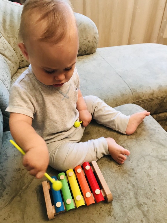 Всегда лежит в гостиной на столике. Илюша когда в настроении побренчать, то подползает и сам начинает водить палочкой туда-сюда по пластинам. Пока научился только такому звуку, но очень увлечено его извлекает. Дальше я его учу стукать по одной клавише - Илья пытается повторять за мной и аккуратно приземлять палочку.