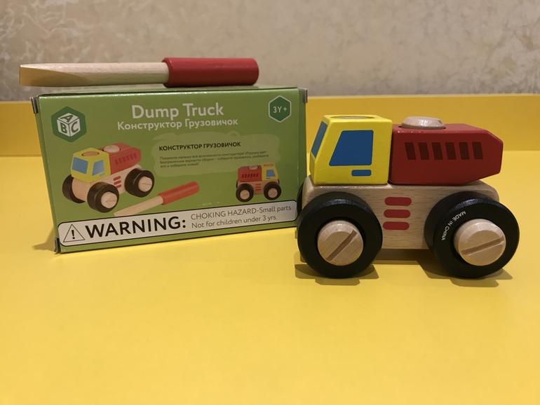 Купила я ее совсем недавно на распродаже в ELC с большой скидкой и это оказалось очень удачной покупкой! Вообще это конструктор - детали машины собраны на гайках и к ним идёт отвертка. Но такая игра возможна только после 2-3 лет, а пока Илья просто катает ее как все мальчишки по дому и всем поверхностям. Машинка как раз по размеру его ладони, а колеса отлично крутятся. Я прям невозможно довольна покупкой - вышла отличная первая машина.