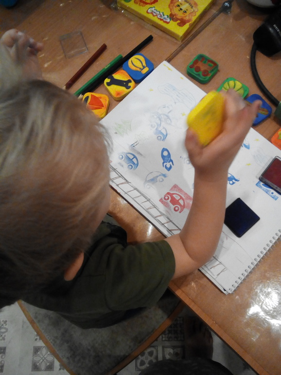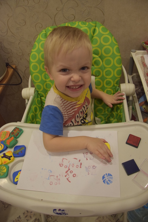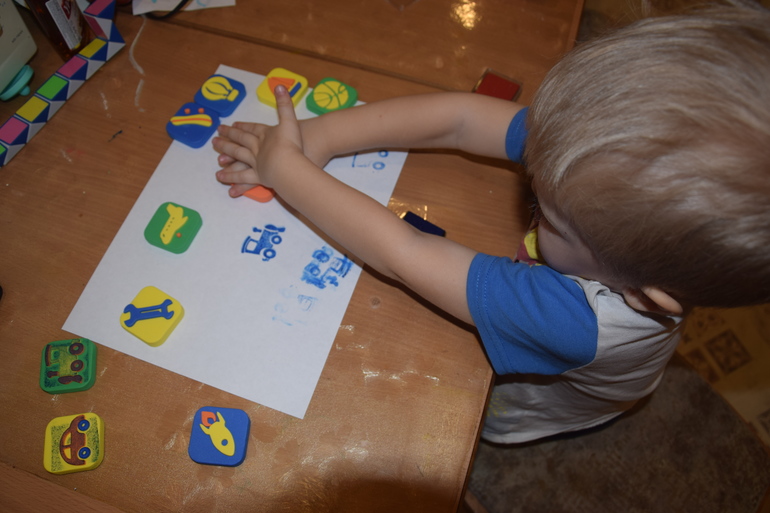 А вот штампики Саше понравились. Купила на WB штампы с чернилами. Пока прошли два урока, Саша окунает в чернила и штампует в хаотичном порядке. Очень доволен этой покупкой!