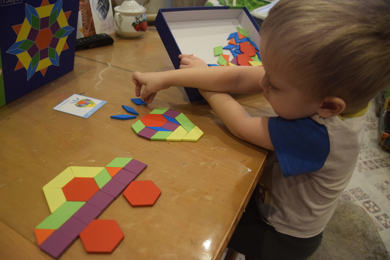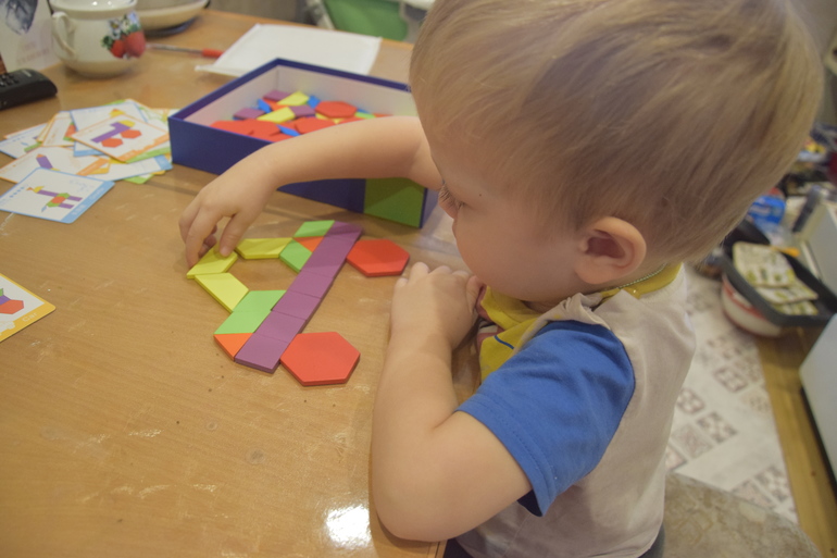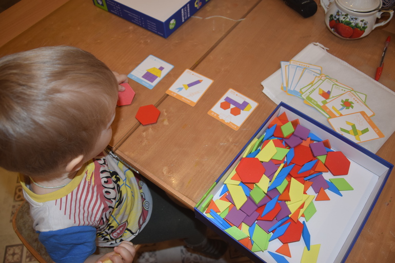 130 деталей. Карточки от сложности * до *****. С одной звездочкой только три карточки. Но, пожалуйста, придумывай сам свои фигуры-предметы. Просто квадратик и трапеция - вот тебе и домик. Саше сложновато пока, я помогаю даже простые рисунки, но прошу его подать мне желтую трапецию, фиолетовый квадрат. Опять же закрепление цветов.