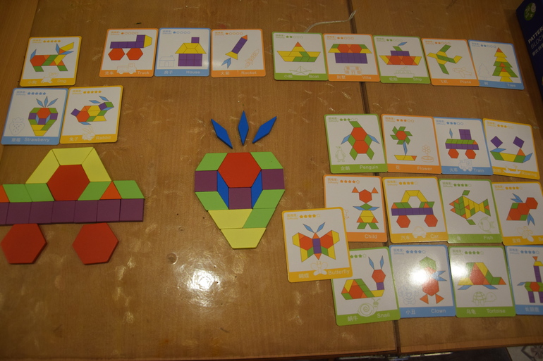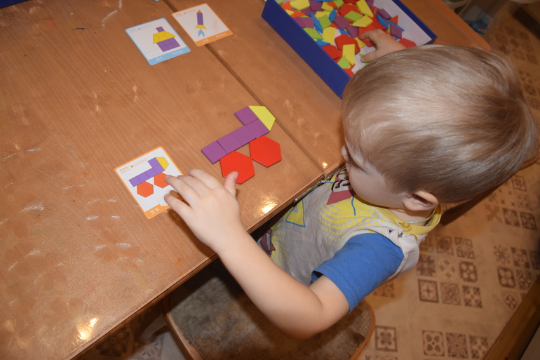 Ещё подглядела у Саши в саду блоки Дьенеша, они по ним занимаются. Купила. Жду посылку. А пока занимаемся танграмом.