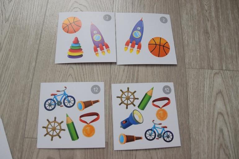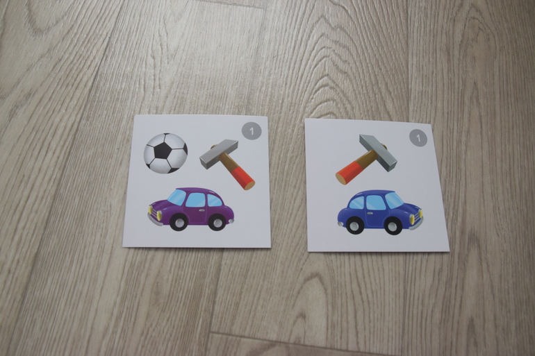 Пока проходим несложные уровни с двумя-тремя предметами. Показываю Саше карточку с тремя предметами - проговариваем, запоминаем. Потом прошу закрыть глаза "Ахалай,махалай,ляськи-масяськи" и вуаля...показываю другую карточку, на которой уже изображено два предмета. Что пропало? Угадывает, радуется:)