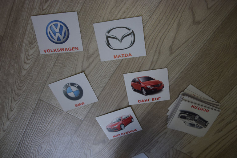 Так как мы фанаты машин, изучаем марки. И на улице, и по карточкам.