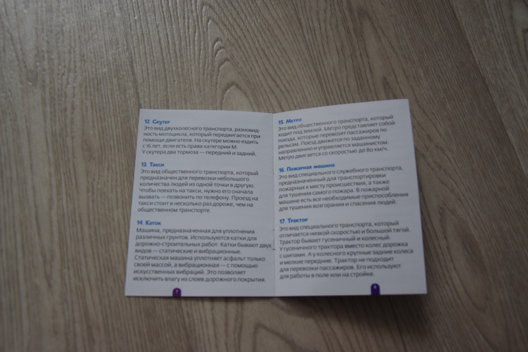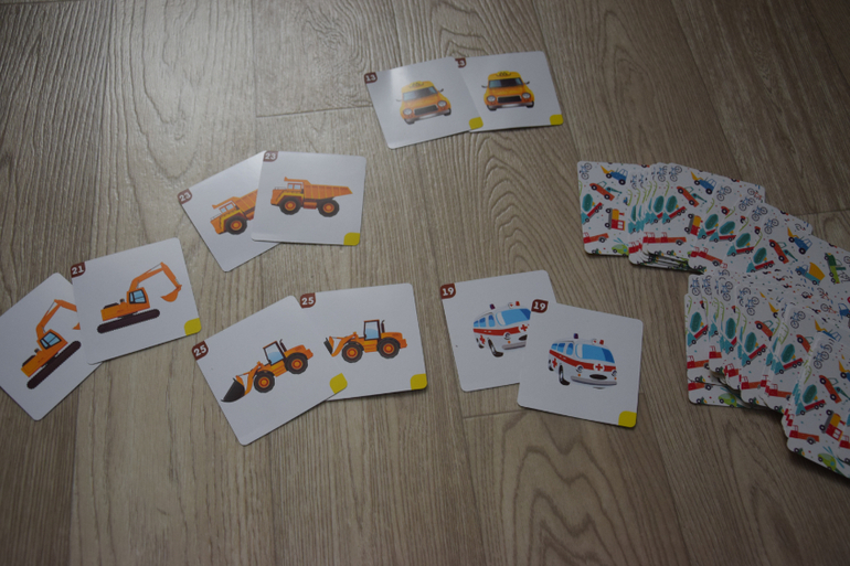 Пятьдесят карточек. 25 пар. Виды транспорта. Предлагается все карточки положить в пять рядов по десять карточек рубашкой вверх. Открыть одну карту. И далее поднимать остальные-искать пару, запоминать и пр. Пока это сложно для нас. Мы кладем все карточки картинками вверх и просто собираем транспорт по парам. В уголках карточек есть цифры, в инструкции можно прочитать информацию про транспорт(опять же скучновато и не понятно пока для нас, к тому же обнаружила кое-какие несоответствия картинке и информации.)