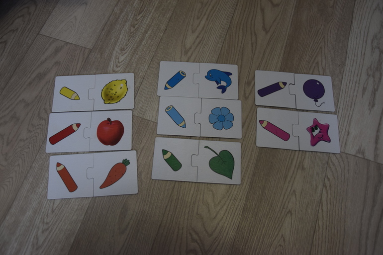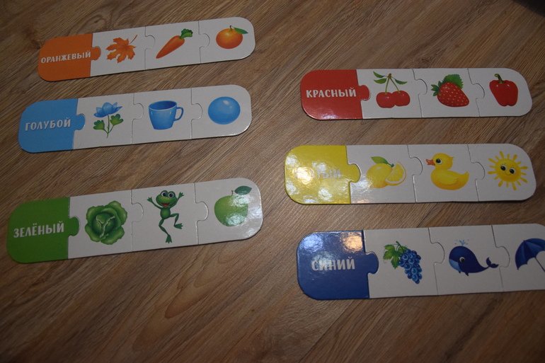 И ещё одна игра в цвета. Мне не понравилось то, что второй и третий элементы в пазле одинаковые, и сын путает их в какой последовательности вставлять (на картинке можно посмотреть, конечно,но не удобно). Но хоть пазлы похожи (например в оранжевом цвете-это листочек и морковка, но если их поменять местами-не подойдут)