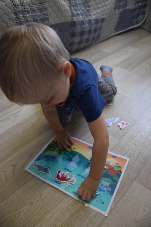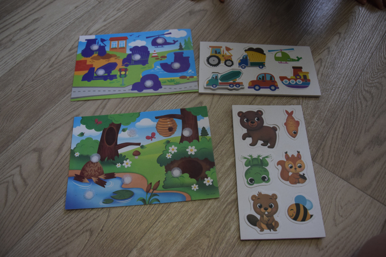 Нравятся очень вкладыши на липучках. Тут сразу два занятия: Приклеиваем элементы на полотно, а потом обратно в пазл