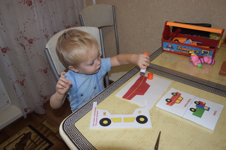 Аппликации. Нравится. Я ему вырезаю детали, а Саша приклеивает их. Немного пробует сам резать ножницами. Просто,хаотично или по линии.