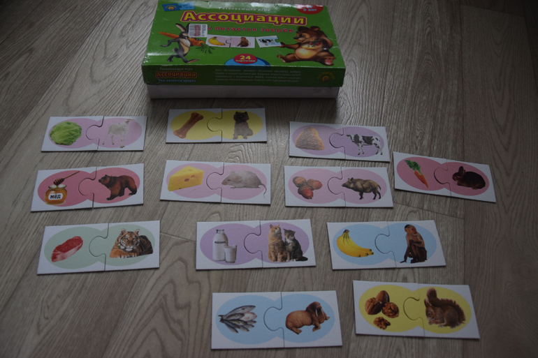 В первом посте рассказывала про ассоциации "Эмоции". Мне очень понравились. Саша пока не очень понимает, но вот попроще ассоциации (два элемента) мы понимаем. От Димы досталось "Кто где живет?",но часть карточек потерялись и я их объединила с другими двойными карточками (собака-ошейник, колечко-пирамида)