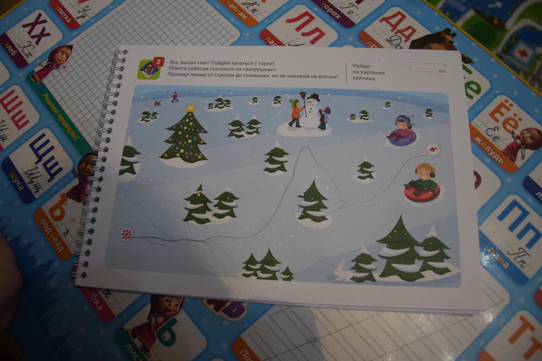 Начали знакомство с лабиринтами. Сложновато пока. Саша ведет карандаш туда, куда сам хочет или просто всё зачеркивает: