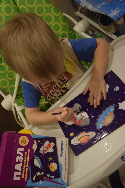 В прошлом посте показывала наши разукрашки водой. Сейчас тоже разукрашиваем. И вот, что нам очень понравилось!В Лабиринте при заказе книг, в подарок заказала два пазла. (про машины и космос). Состоит из 4-х элементов. Прикрепляются элементы друг другу не очень ровно и сложновато (мягкие пазлы) (немного Саша нервничает из-за этого), но зато они многоразовые. Разукрасил водой-появились картинки. Пазл высох-опять белые картинки, можно вновь красить. Саше очень понравилось!