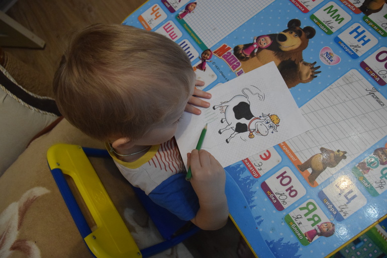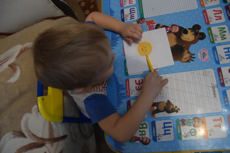 Пробуем рисовать элементарные вещи: травку для корову, лучики для солнца. Мама помогает держать правильно карандаш. Читала, что где-то к 3,5 годам ребенок учится правильно держать карандаш сам.