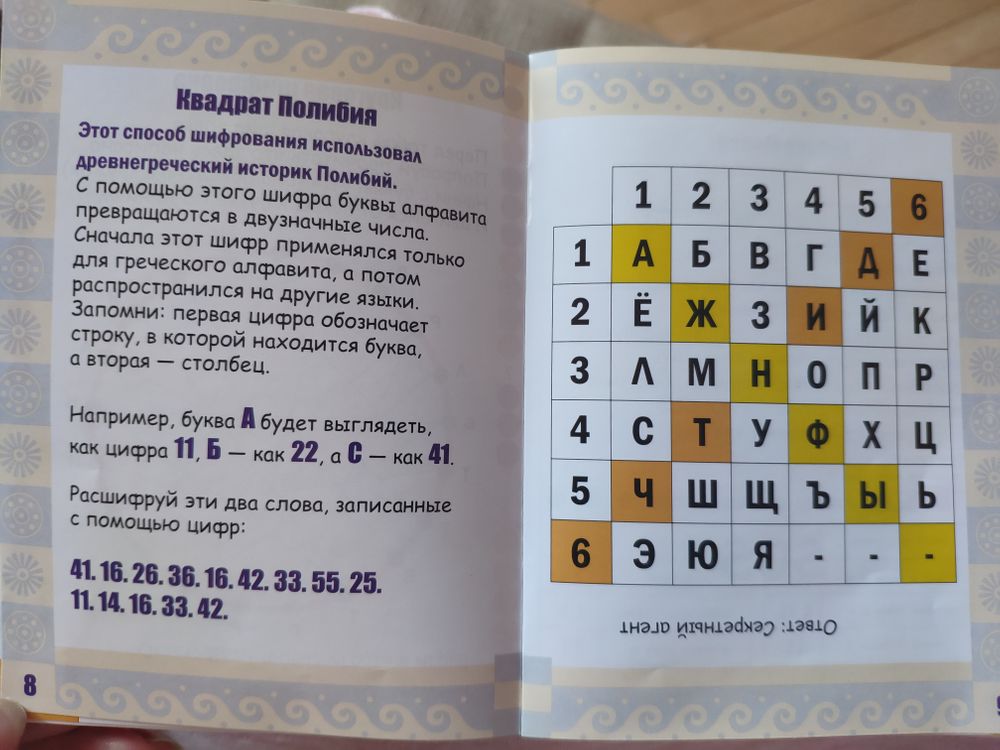 В книжечке есть азбука Морзе, флажковая и семафорная, рассказывается про шифр спартанцев, и несколько других: