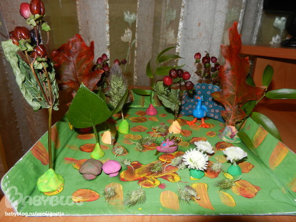 Взяли крышку от коробки из под обуви. Стеша раскрасила все зеленой краской, потом мы красной и желтой краской "нашлепали" листочки. Дали подсохнуть пока мама чикала матерьял с папиного юбилейного букета. Затем мама делала треугольнички из пластилина, а Стеша их приклеивала ПВА. Потом она с большим интузиазмом вставляла в них наши деревья.. Грибочки делали вместе, ну а ежика она давно умеет делать. Вуаля и готово. Да еще павлина потом притащила и поставила. Хоть они в лесу и не живут, но этот удостоился чести.