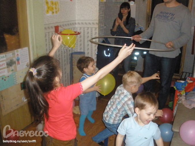 3,"Попади в обруч" В обруч кидаем шарики, потом была импровизация, появился голодный бегемот и его надо было шариками накормить, а потом бегемот наелся и кормил всех деток.