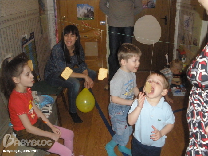 1,"Откуси печенье". Подвесили печенье на веревочках, и нужно было откусить без рук.(прикольно, мой активный дите кусал!)