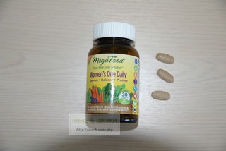 Итак, MegaFood, Women's One Daily, Whole Food Multivitamin & Mineral, В стеклянной баночке содержатся 30 таблеток, в день принимать по 1 штуке.По размеру таблетки довольно крупные. На вкус солоноватые, пахнут приправой. Состав полностью натуральный: витамин С из апельсина, фолиевая кислота из брокколи и пр. Добавлен витамин К, его в мультивитаминных комплексах редко встретишь. Суточные дозировки витаминов в составе нормальные т.е не зашкаливают за 1000 %. Из положительных моментов за время приема могу отметить усиленный рост ногтей. Да, и бодрости в целом прибавилось.