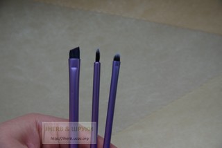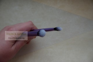 Из всего набора я пользуюсь кистью для растушевки и тонкой кисточкой для подводки. ей удобно рисовать стрелки на верхнем веке. Для этих целей у меня есть рассыпчатые минеральные тени, влажной кисточкой их и наношу.
