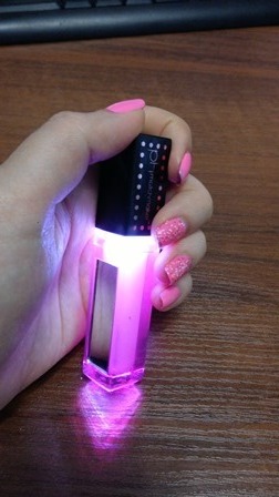 Исполнение дизайна просто на ура! Зеркальце на тубе, все четко закрывается. А наверху есть кнопочка. Нажимаем и вуаля) Горит миленькая розовая подсветка)