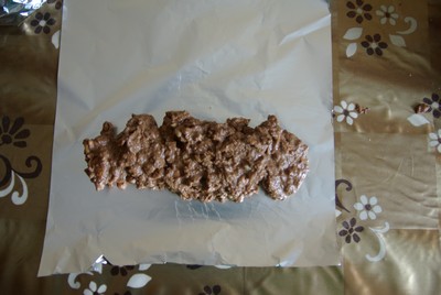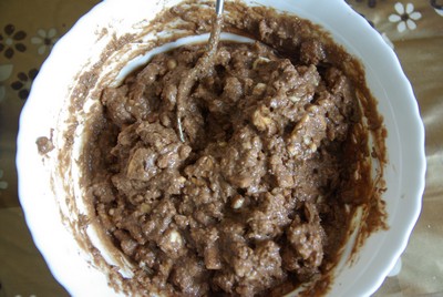 Потом надо всыпать в эту жидкость печенье. У нас получилось жидковатое "тесто", делали на глаз. В принципе, его уже можно и просто так ложкой есть, а не формировать в колбаски :))