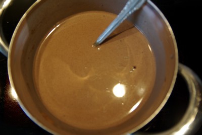Печенье поломать ( у нас были остатки из новогодних подарков и затяжное Мария). Молоко + какао + масло + сахар смешать и подогреть