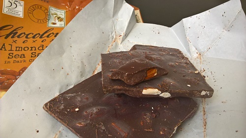 В итоге, что имеем : темный полусладкий "шоколад-любовь" - содержание какао 55%, плюс необычное сочетание обжаренного миндаля и морской соли.