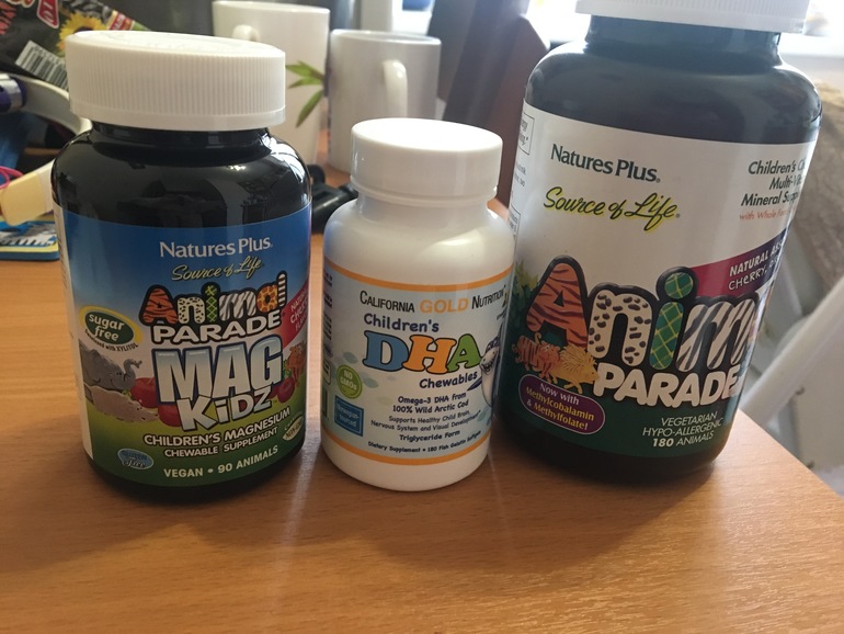 Если ребенок садовский, то омегу/витамины утром с едой, магний вечером. Если если есть возможность поделить омегу/витамины с разным приемом пищи - мне так нравится больше.