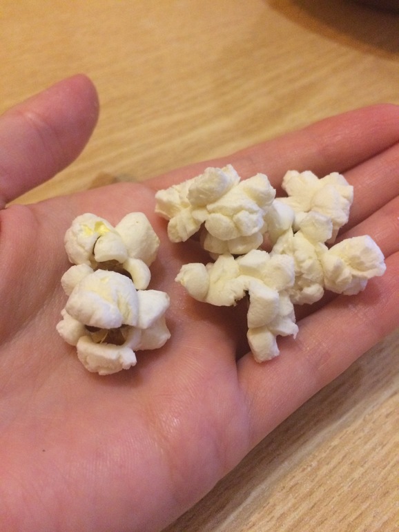 Зернышки чистые, жарила на кокосовом масле. 3 кулачка зерен хватило на троих на раз покушать. Не раскрылись 16 зерен. Даже специально посчитала))) Некоторые разорвало от души. Некоторые скромно.