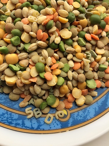 Зеленый расщепленный горох, желтый горошек, ячмень, чечевица и растительные макароны (мука из манной крупы, порошок шпината, томатный порошок и / или порошок паприки, ниацин, железо, мононитрат тиамина, рибофлавин и фолиевая кислота.