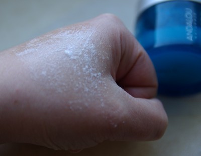 На лбу у меня более плотная кожа, но даже там я не могу им пользоваться. Домазываю на тело, но для пяток он слишком деликатный )) В теплом помещении скраб тает, поэтому лучше держать его не в ванной комнате.