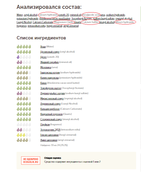 * красным овалом выделены ненайденные на Экопортале компоненты. Например: thioglycolic acid - оказывает депиляционное действие, синтетическое происхождение, средний фактор опасности.