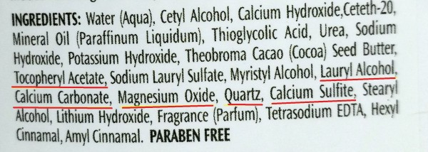 Water (aqua), cetyl alcohol, calcium hydroxide, ceteth-20, mineral oil (paraffinum liquidum), thioglycolic acid, urea, sodium hydroxide, potassium hydroxide, theobroma cacao (cocoa) seed butter, tocopherol, helianthus annuus (sunflower) seed oil, sodium lauryl sulfate, myristyl alcohol, quaternium-15, stearyl alcohol, lithium hydroxide, fragrance (parfum), tetrasodium edta, hexyl cinnamal, butylphenyl methylpropional, amyl cinnamal (22 ингредиента).