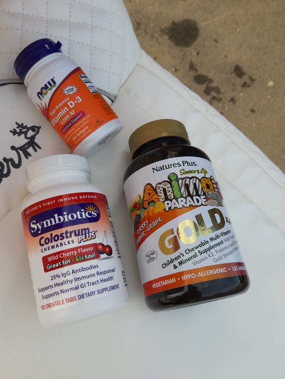 Мультитвимины можно совмещать с приемом колострума, но я бы разнесла по времени. Начала давать мульти, потом через 2 недели колострум. Вдруг аллергия? Если ребенок не склонен, то можно давать одновременно. Банки Анимал парад хватит на 2 мес приема, можно пропить 1 мес сейчас , остаток осенью.