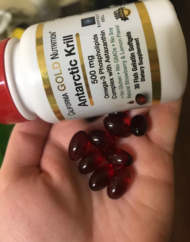 Омегу 3 разных производителей я принимаю постоянно, кроме летнего периода. Иногда Простой рыбий жир заменяю жиром арктического криля. Масло криля отличается от рыбьего жира содержанием астаксантина, это один из сильных антиоксидантов, который защищает клетки от разрушающего воздействия свободных радикалов, а жирные кислоты Омега-3 в нем находится в двух фомах: полиненасыщенные жирные кислоты, идентичные жирным кислотам в рыбьем жире и полиненасыщенные жирные кислоты в виде фосфолипидов.
