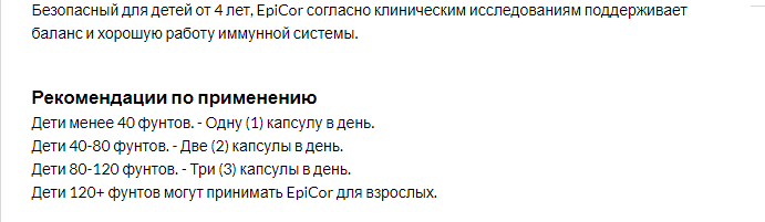 Безопасный для детей от 4 лет, EpiCor согласно клиническим исследованиям поддерживает баланс и хорошую работу иммунной системы. ссылка на эпикор, снятый с производства, еле нашла)))) ее лучше положить в закладки и не терять, тк там ооочень ценная информация, как давать эпикор, в зависимости от веса ребенка. Сейчас производитель решил не заморачиваться и просто написал дозировка-1 капсула((