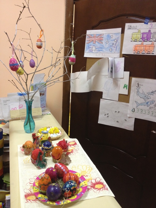 У меня группа Монтессори, занятия 2,5 часа, продолжительность Монтессори урока 2 часа, потом у детей чаепитие, потом либо занятие по ИЗО, либо музыкальные занятия. Сначала мы учились рисовать узоры на рамках Монтессори, это такие металлические рамки, дети обводят овал, рисовать зигзаги и полоски оказалось сложной задачей, потом они эти овалы вырезали, работали также на них с пластилином и бисером, а потом мы уже делали подставки для яиц и их раскрашивали. Лучше всего смотрятся на яйцах объемные краски-прилипайки и детям с ними работать интересно, потом мы еще использовали трафареты готовые и наклейки, на этом фото их первая работа, вторую я не успела сфотографировать.
