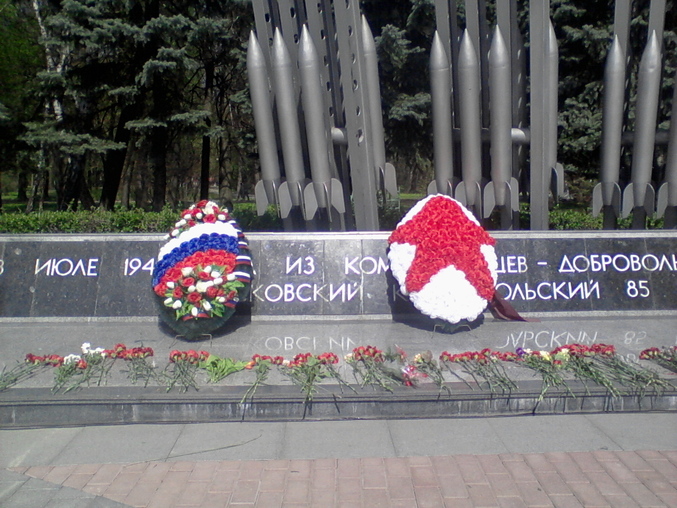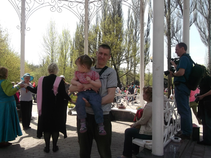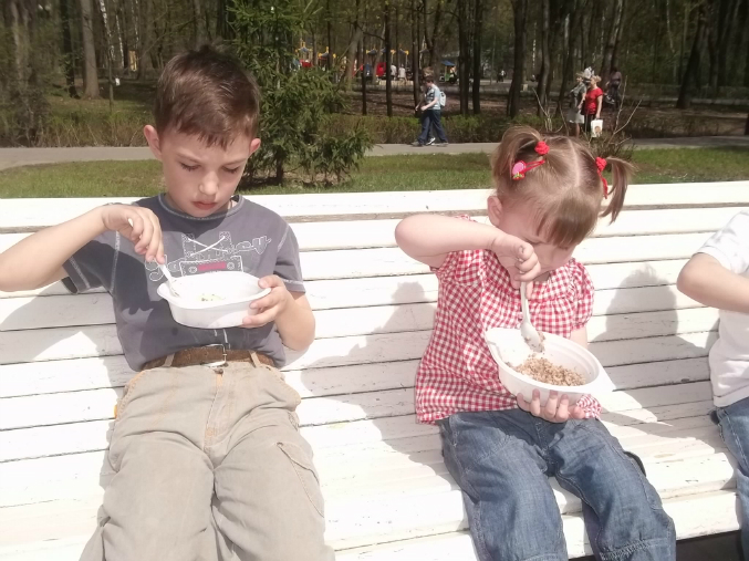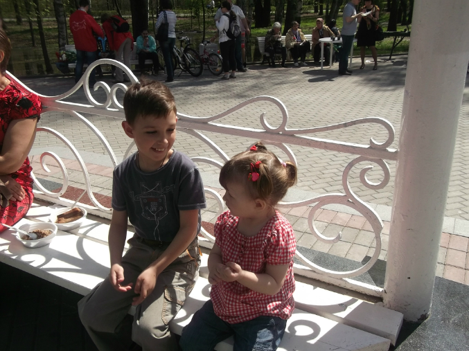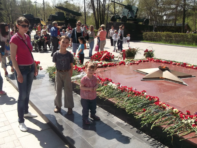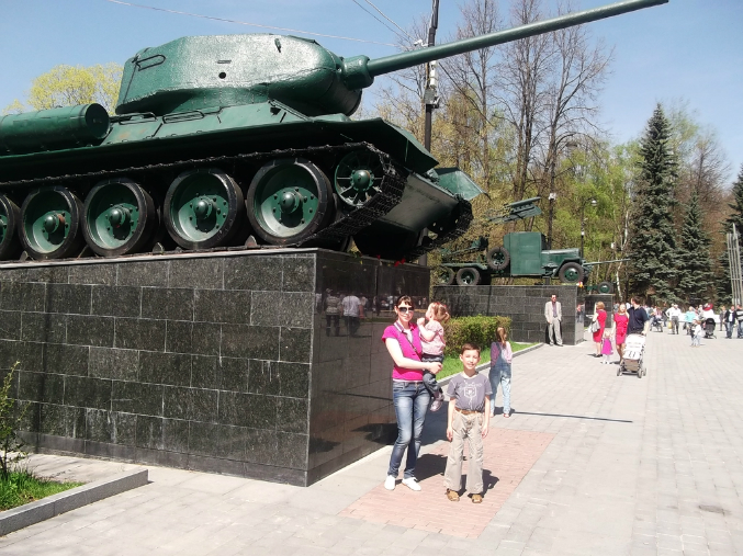В парке было очень здорово, сначало прошел военный духовой оркестр, затем прошли ветераны, мы пошли следом, но не дошли, т.к. не смогли пройти мимо детской площадки "Кроха" и завернули на качели-карусели )) Накатавшись, прогулялись по парку, затем поели солдатской каши, дети уплетали за обе щеки, да и мы с мужем с удовольствием поели, каша была очень вкусная и тушенки в ней было много-много!!! Подкрепившись, посидели в беседке, послушали военные песни, а дети даже поплясали )) Затем прогулялись вдоль памятников с военной техникой, постояли у вечного огня, подарили цыеты ветеранам и выразили им свою благодарность. Хотели еще покататься на лодке, но очередь была огромная, решили отложить на следующие выходные.
