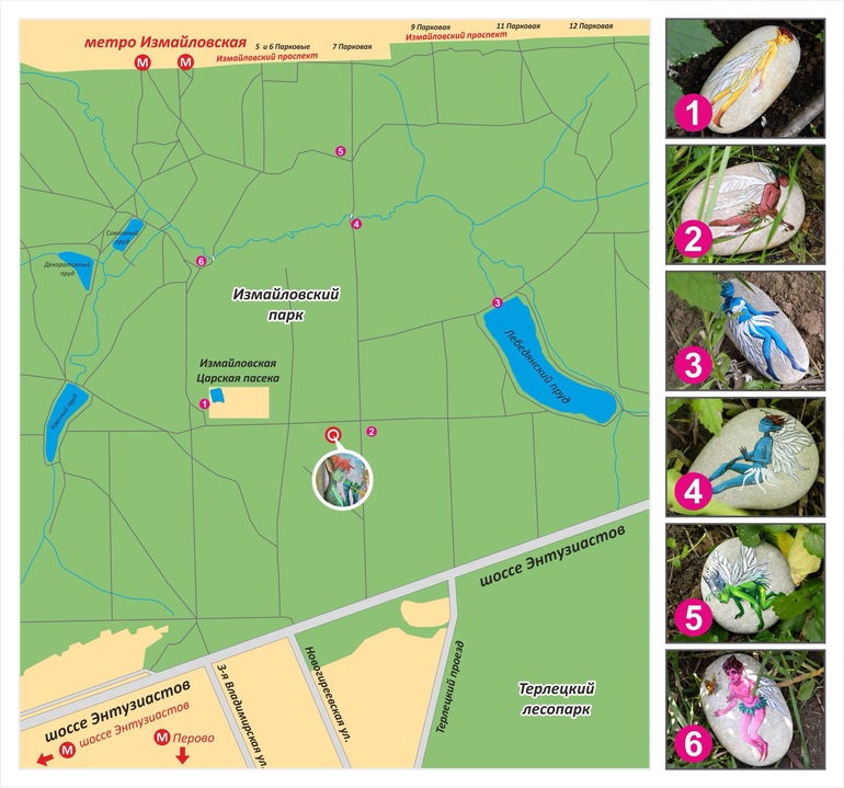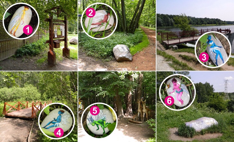 Сказочные существа, о которых идет речь, нарисованы на камнях художницей Евгения Хлынина - автором знаменитого эльфа на дереве в Измайловском лесопарке. А cуть квеста заключается в том, чтобы найти все 6 камней с рисунками. В помощь игрокам дается карта с условным обозначением точек, где притаились сказочные обитатели парка. В случае обнаружения, необходимо каждого сфотографировать и в одном письме направить в адрес ГПБУ «Мосприрода» по Восточному округу в группу Вконтакте (vk.com/ecovao) или Facebook (facebook.com/ecoprosizm).