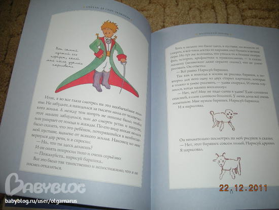 У меня такой же Маленький принц! Выбирала между книгой с Гольц и этой. Выбрала авторские рисунки специально. Для меня "Маленький принц" книга особенная, читаю, и фантазирую, фантазирую, и авторские иллюстрации нисколько не мешают полету фантазии, они ненавязчивые, непосредственные, как будто ребенок рисовал. А после просмотра иллюстраций Гольц ее образ принца как-то отпечатался в мозгу и я уже волей-неволей его представляю, когда думаю о книге. А я хочу, чтобы у меня сынок, читая эту книгу тоже фантазировал и у него был свой маленький принц. Но это исключительно мои "тараканы", хотя иллюстрации Гольц очень красивые, мне больше всех ее работ нравятся.