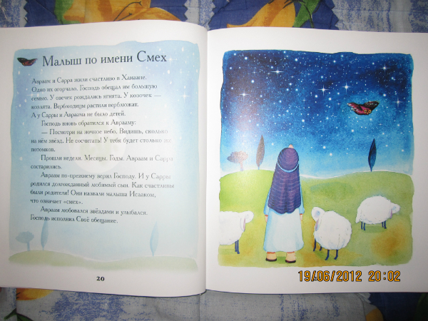 Ксюша, за что ей огромное спасибо. Книга довольно тяжелая и увесистая, напечатанна на мелованной бумаге. На каждый день в году тут есть свой библейский рассказ - то есть за год с ребенком 6 - 8 лет вполне можно ее прочесть целиком. К каждому рассказу есть полностраничная иллюстрация. Что еще мне нравится в этой Библии - так это то, что здесь нет изображений Иисуса, то есть у ребенка не отложится в голове стереотип того, как вроде бы (а этим грешат многие иллюстраторы Библии) должен был выглядеть Спаситель.
