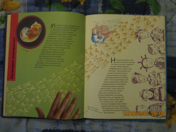 Мое сокровище:) Книга, которая рассказывает о зарождении жизни с христианской точки зрения. С позиций многих моих знакомых в ней много спорных моментов - изображения яйцеклетки и сперматозоида, весьма короткий, но емкий рассказ о родах (и пара слов о кесаревом сечении), фотографии малышей на разных стадиях развития...Меня это совершенно не смущает: и я точно, а как мама-биолог - абсолютно точно уверенна, что это не будет смущать и моего сына. Я сумею рассказать и показать ему все так, что это будет для него естественым, и не вызовет нездорового ажиотажа. Кстати, Кирилл и сейчас знает, что был когда-то таким маленьким, что умещался в мамином животе, и это не вызывает у него удивления, так как он видел малышей на площадке, и знает (от меня, конечно), что когда-то и он сам был таким же маленьким. Вобщем, я за прогресс, за информационное развитие - но в умеренных пределах, которые, конечно, устанавливает для себя самостоятельно каждый родитель.
