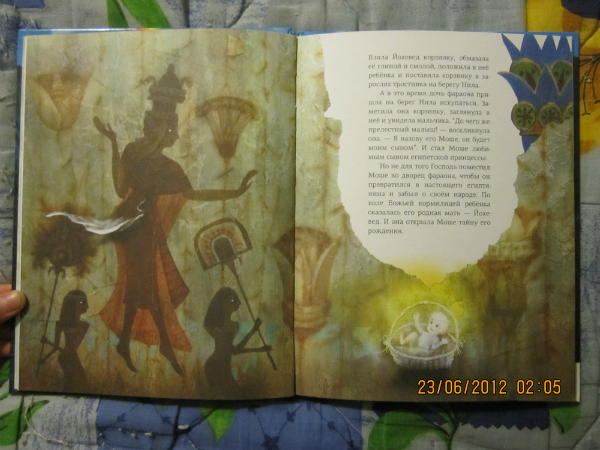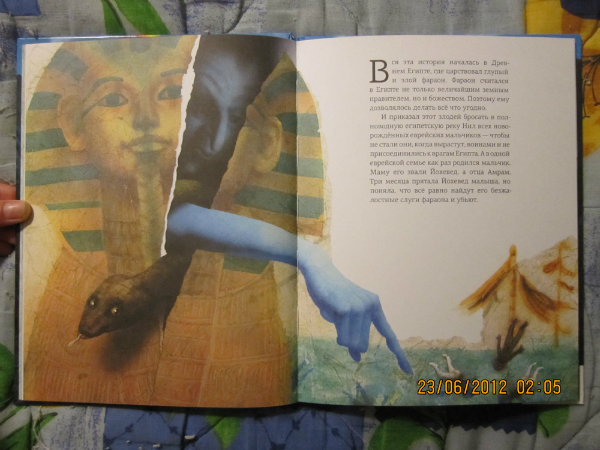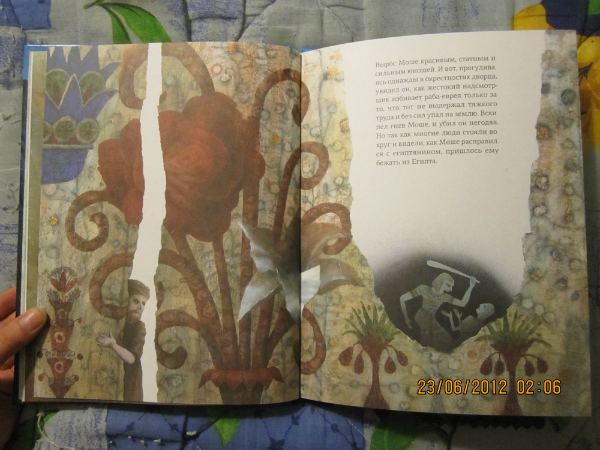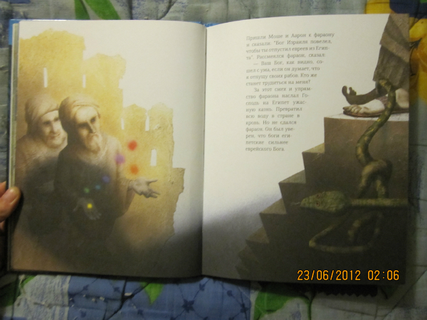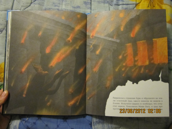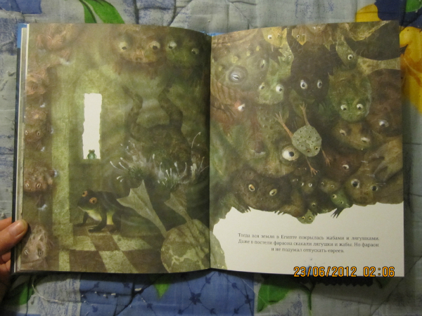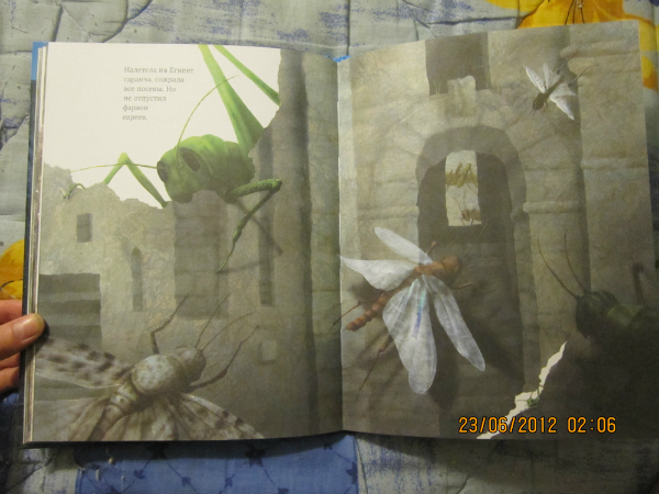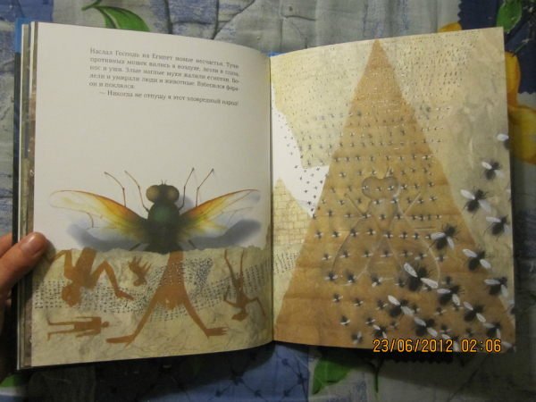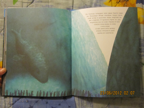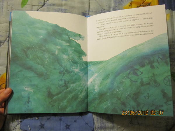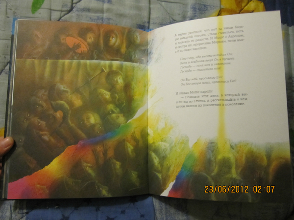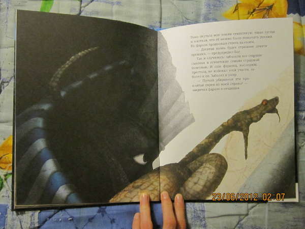Теперь о книге. Издана она при поддержке какой-то там еврейской семьи, и являет собой краткий рассказ об исходе евреев из Египта под предводительством Моисея (Моше). Тут и десять казней, и пропустившие евреев и потопившие египтян воды Красного моря, и радость освобождения, и хвалебная песнь Мириам, но самое главное - рисунки Юлии Гуковой. Книга напечатана на офсете, и это, пожалуй, ее главный недостаток. Насмотревшись в "Волшебнике страны Оз" как могут выглядеть рисунки Гуковой на меловке, я теперь не воспринимаю их на офсете. Гукова в этой книге очень мрачная, что соответствует настроению самой книги, и все эти переливы цветов от лилового до чернильно-серого как нельзя лучше подчеркивают усиливающееся напряжение в повествовании, от самой первой до десятой, и самой сокрушительной, казни. Но есть и всплески радости - они связанны с освобождением и ликованием еврейского народа, с Богом, который вывел их из плена и даровал свободу. Вообще эта книга - шедевр, и я была бы очень рада, если бы Юлия Гукова проиллюстрировала еще что-нибудь из Ветхого Завета, а лучше - целиком всю Библию. Как Доре. А что? Лично я считаю, что она не менее гениальна, чем этот средневековый живописец.