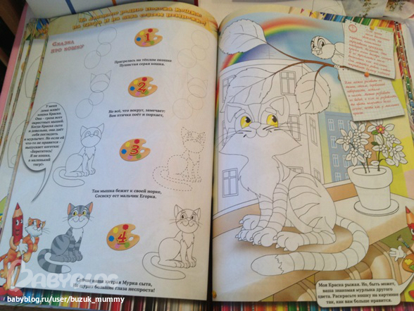 На каждом развороте книжки своя тема урока, где учат рисовать какого-то зверя (еще цветочки-деревца и машинки), дают стишок-сказку про этого зверя, есть пунтир для того, чтобы ребенок тренировался обводить, раскраска, а также на страницах много разных поучительных заметок и вопросов. Мне понравилось, что сначала мама сама может посмотреть как и что рисуется и росовать с малышом, а когда ребенок подрастает будет сам обводить и раскрашивать, а потом и научится сам рисовать! Формат книжки А3.