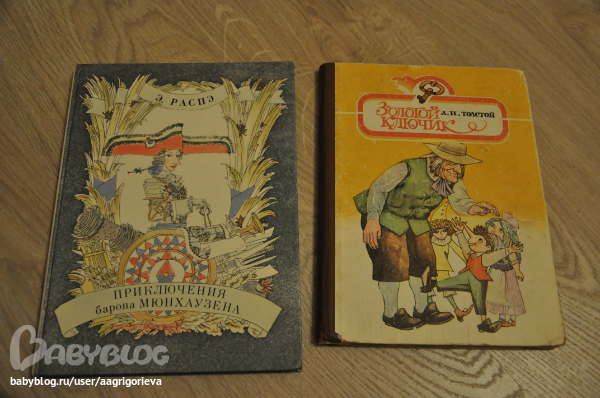 Это две книги моего детства "Приключения барона Мюнхаузена" и "Золотой ключик". До второй мы скоро уже доберемся, а вот первой еще надо полежать. Надо бы еще у родителей и на даче покапаться там много чего можно найти, книг было много.