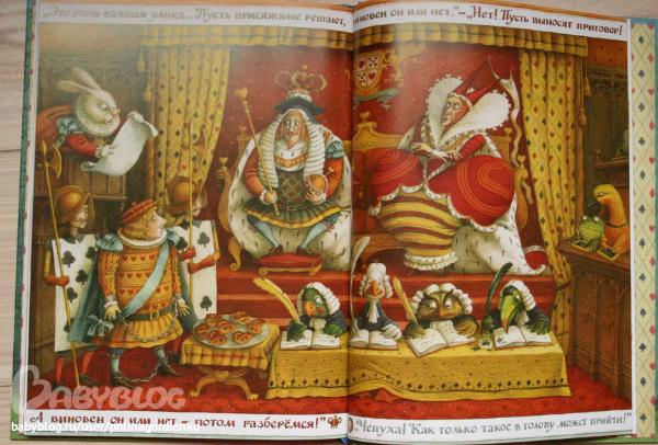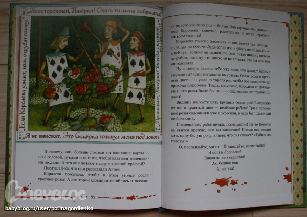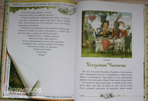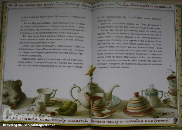 И даже скажу, что эту книгу скорее надо брать из-за иллюстраций, а не текста! Я понимала, что тут все будет кратко и без заумностей, но настолько кратко! Вначале это как-то не очень заметно (пока Алиса не попадает в заветный сад), приятен диалог писателя с читателем. Но потом все события происходят так быстро, что не ясен сам переход между ними. Например, Алиса беседует с Шляпником и Мартовским зайцем, а потом уже оказывается в саду, а как она туда попала, даже не объясняется толком. А уж игра в крокет вообще замята.